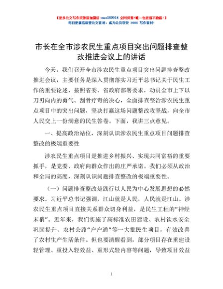 / 市长在全市涉农民生重点项目突出问题排查整改推进会议上的讲话