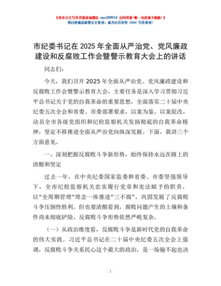 / 市纪委书记在2025年全面从严治党、党风廉政建设和反腐败工作会暨警示教育大会上的讲话