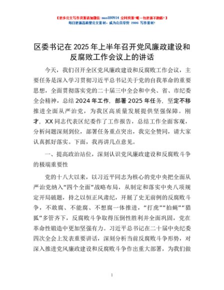 / 区委书记在2025年上半年召开党风廉政建设和反腐败工作会议上的讲话