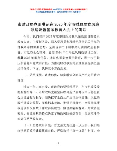 / 市财政局党组书记在2025年度市财政局党风廉政建设暨警示教育大会上的讲话