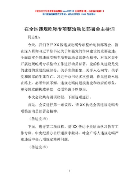 / 在全区违规吃喝专项整治动员部署会主持词