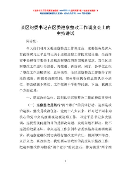 / 某区纪委书记在区委巡察整改工作调度会上的主持讲话
