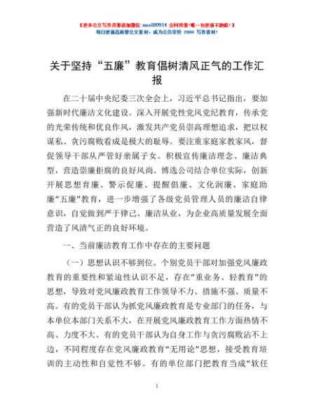 / 关于坚持“五廉”教育倡树清风正气的工作汇报