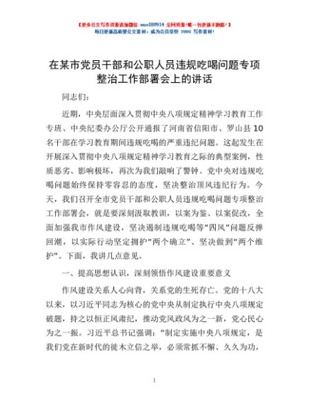 / 在某市党员干部和公职人员违规吃喝问题专项整治工作部署会上的讲话