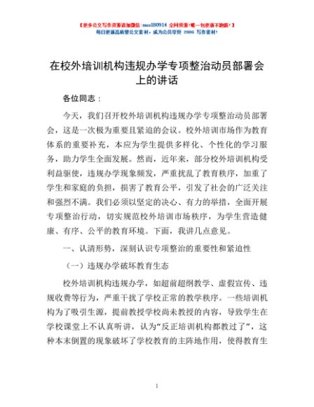 / 在校外培训机构违规办学专项整治动员部署会上的讲话