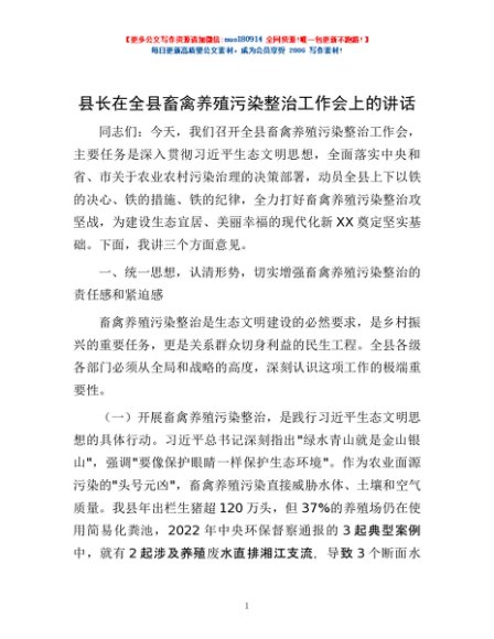 / 县长在全县畜禽养殖污染整治工作会上的讲话