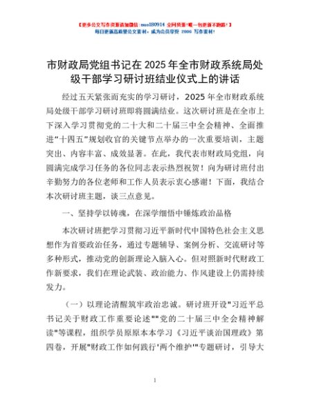 / 市财政局党组书记在2025年全市财政系统局处级干部学习研讨班结业仪式上的讲话