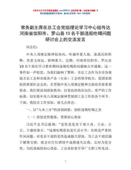 / 常务副主席在总工会党组理论学习中心组传达河南省信阳市、罗山县10名干部违规吃喝问题研讨会上的交流发言