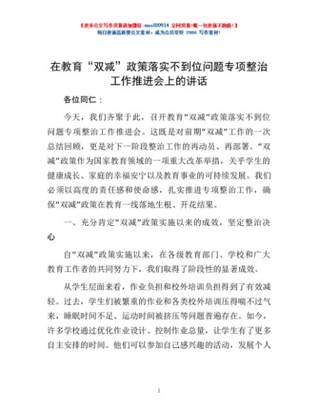 / 在教育“双减”政策落实不到位问题专项整治工作推进会上的讲话
