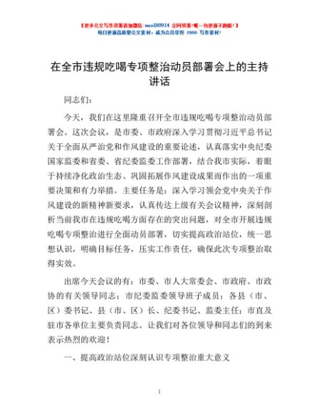 / 在全市违规吃喝专项整治动员部署会上的主持讲话