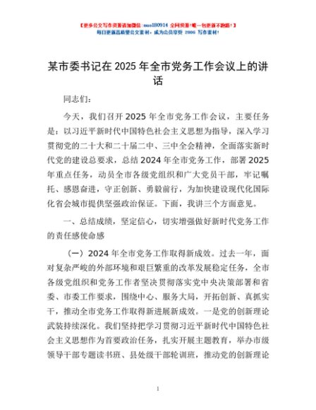 / 某市委书记在2025年全市党务工作会议上的讲话
