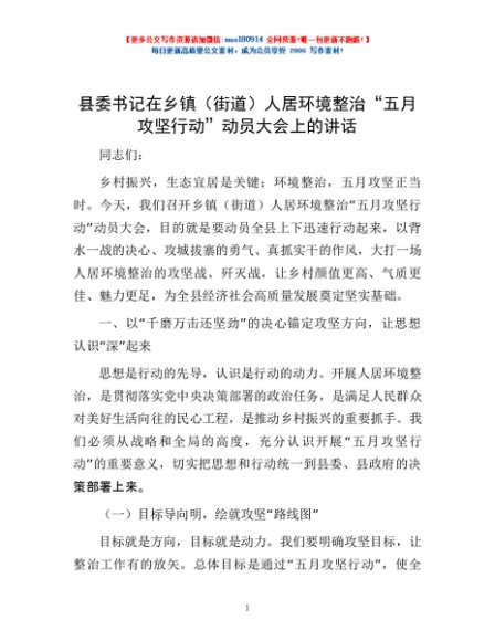 / 县委书记在乡镇(街道)人居环境整治“五月攻坚行动”动员大会上的讲话
