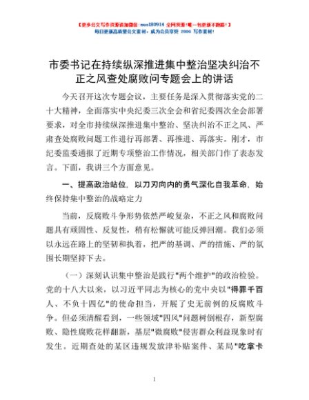 / 市委书记在持续纵深推进集中整治 坚决纠治不正之风查处腐败问专题会上的讲话