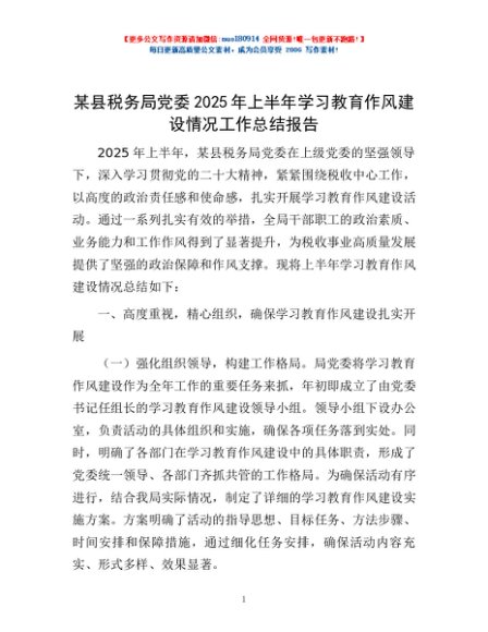 / 某县税务局党委2025年上半年学习教育作风建设情况工作总结报告