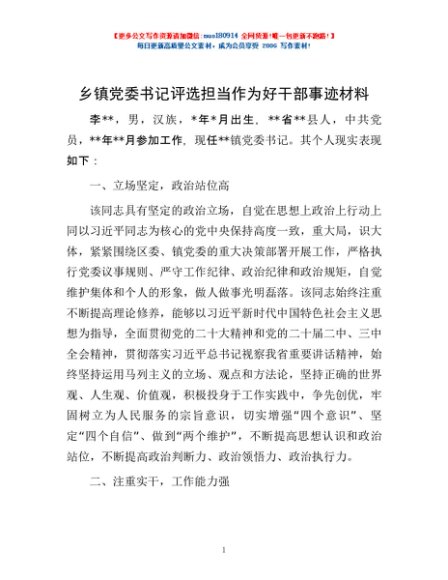 / 乡镇党委书记评选担当作为好干部事迹材料
