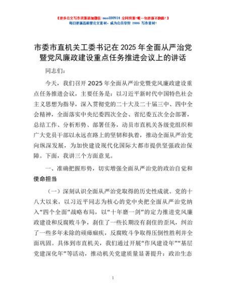 / 市委市直机关工委书记在2025年全面从严治党暨党风廉政建设重点任务推进会议上的讲话