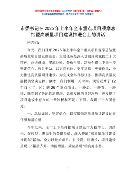 / 市委书记在2025年上半年全市重点项目观摩总结暨高质量项目建设推进会上的讲话