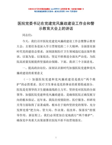 / 医院党委书记在党建党风廉政建设工作会和警示教育大会上的讲话