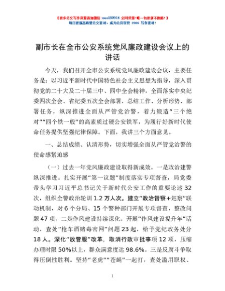 / 副市长在全市公安系统党风廉政建设会议上的讲话