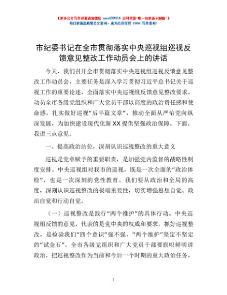 / 市纪委书记在全市贯彻落实中央巡视组巡视反馈意见整改工作动员会上的讲话