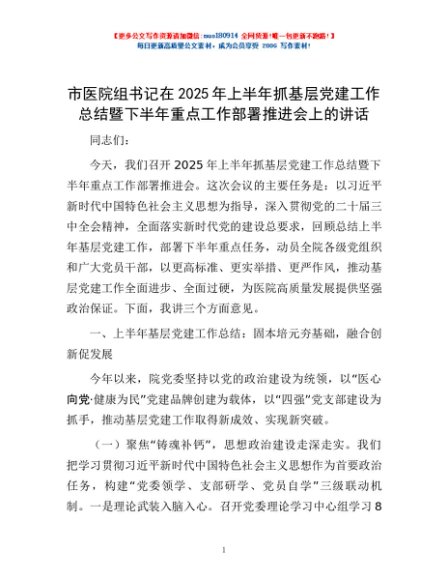 / 市医院组书记在2025年上半年抓基层党建工作总结暨下半年重点工作部署推进会上的讲话