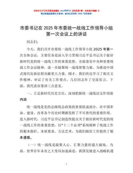 / 市委书记在2025年市委统一战线工作领导小组第一次会议上的讲话