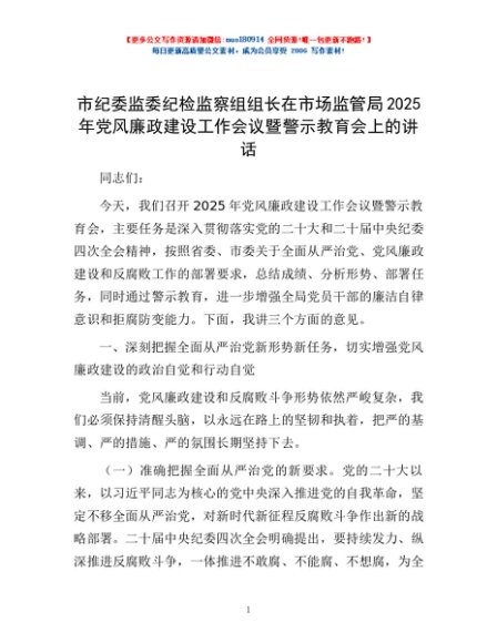 / 市纪委监委纪检监察组组长在市场监管局2025年党风廉政建设工作会议暨警示教育会上的讲话