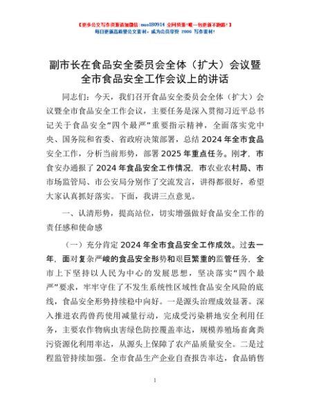 / 副市长在食品安全委员会全体(扩大)会议暨全市食品安全工作会议上的讲话
