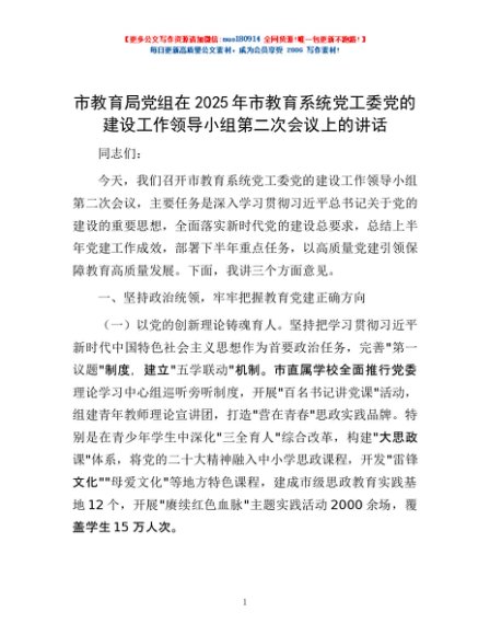 / 市教育局党组在2025年市教育系统党工委党的建设工作领导小组第二次会议上的讲话