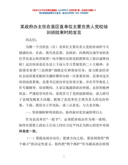 / 某政府办主任在县区直单位主要负责人党校培训班结束时的发言
