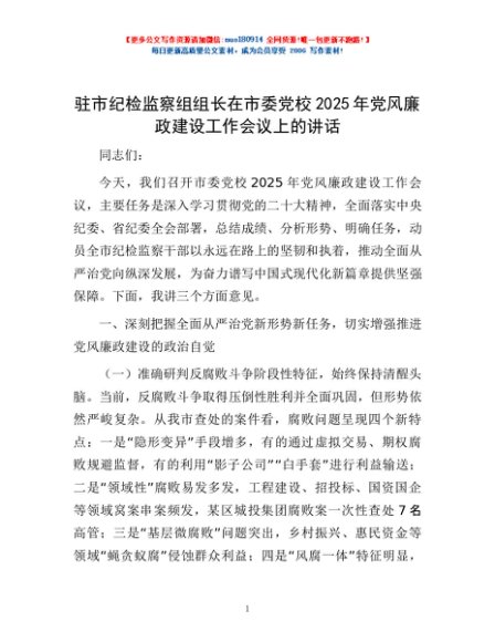 / 驻市纪检监察组组长在市委党校2025年党风廉政建设工作会议上的讲话