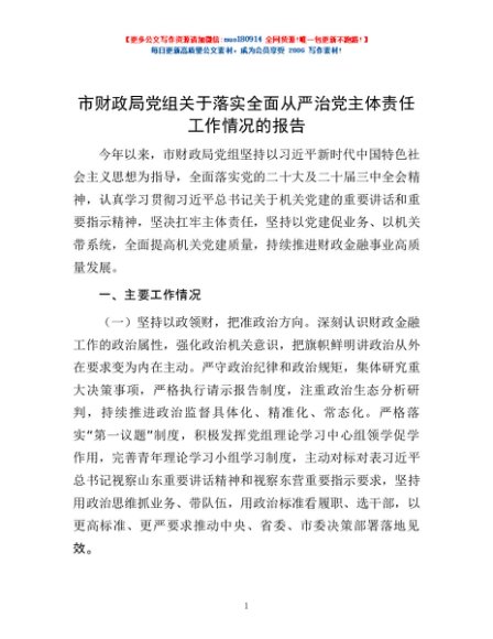 / 市财政局党组关于落实全面从严治党主体责任工作情况的报告