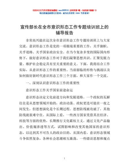 / 宣传部长在全市意识形态工作专题培训班上的辅导报告