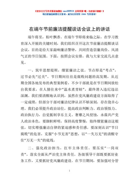 / 在端午节前廉洁提醒谈话会议上的讲话