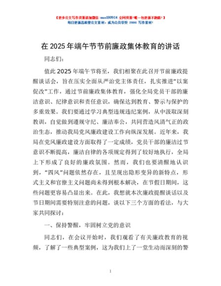 / 在2025年端午节节前廉政集体教育的讲话