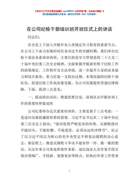 / 在公司纪检干部培训班开班仪式上的讲话