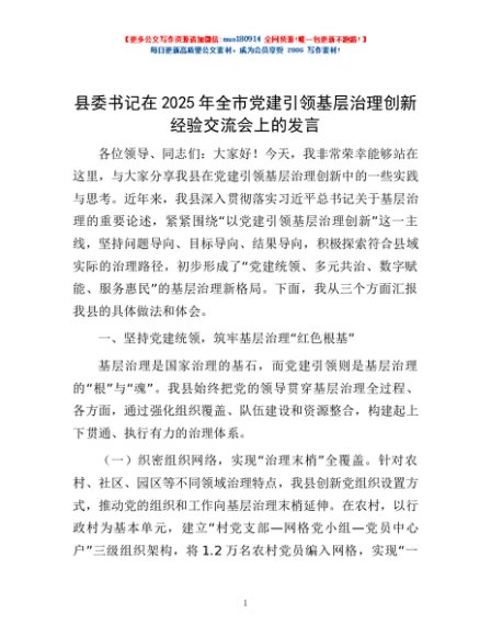 / 县委书记在2025年全市党建引领基层治理创新经验交流会上的发言