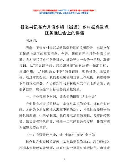 / 县委书记在六月份乡镇(街道)乡村振兴重点任务推进会上的讲话