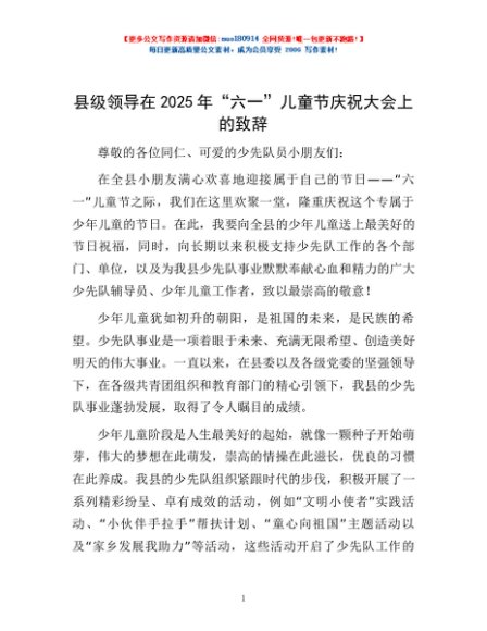 / 县级领导在2025年“六一”儿童节庆祝大会上的致辞