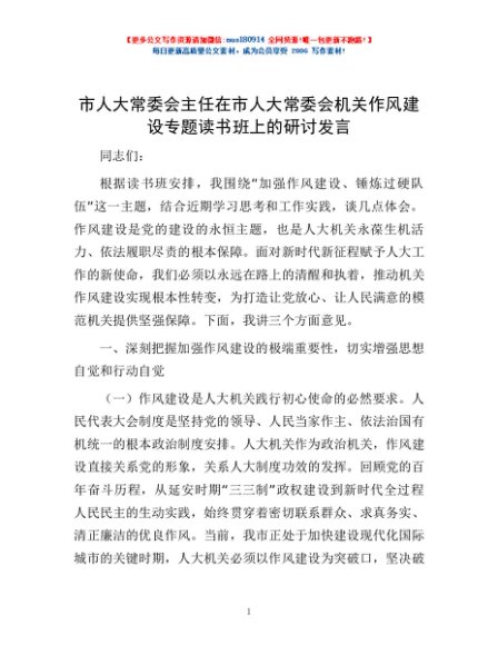 / 市人大常委会主任在市人大常委会机关作风建设专题读书班上的研讨发言