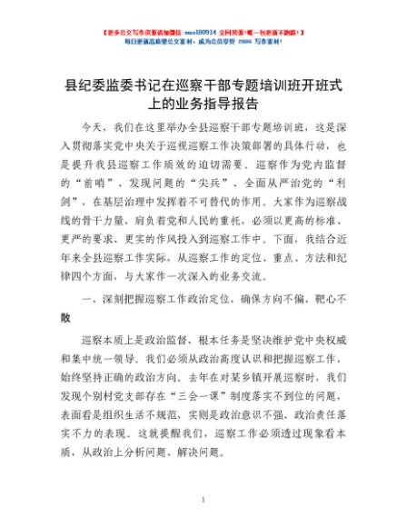 / 县纪委监委书记在巡察干部专题培训班开班式上的业务指导报告