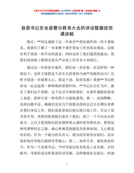 / 县委书记在全县警示教育大会的讲话暨廉政党课讲稿