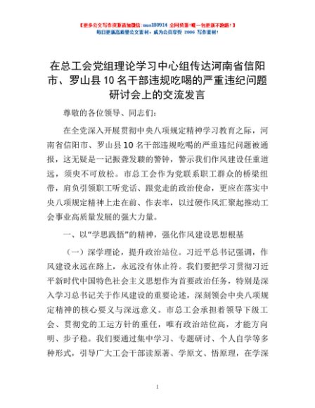 / 在总工会党组理论学习中心组传达河南省信阳市、罗山县10名干部违规吃喝的严重违纪问题研讨会上的交流发言