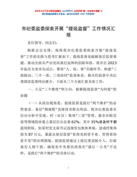 / 市纪委监委探索开展“提级监督”工作情况汇报