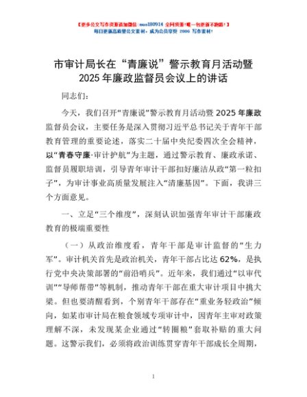 / 市审计局长在“青廉说”警示教育月活动暨2025年廉政监督员会议上的讲话