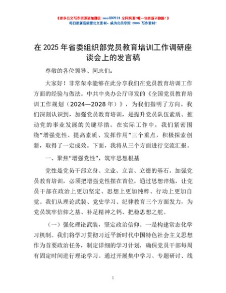 / 在2025年省委组织部党员教育培训工作调研座谈会上的发言稿