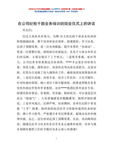 / 在公司纪检干部业务培训班结业仪式上的讲话