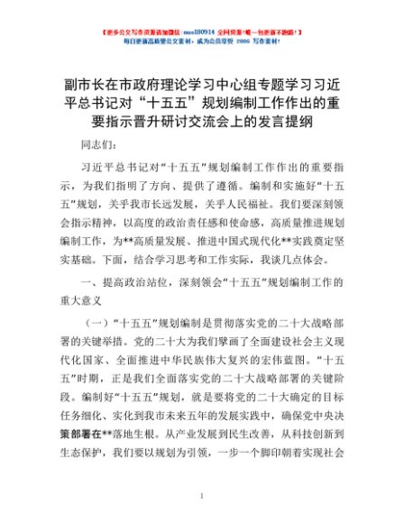 / 副市长在市政府理论学习中心组专题学习习近平总书记对“十五五”规划编制工作作出的重要指示晋升研讨交流会上的发言提纲