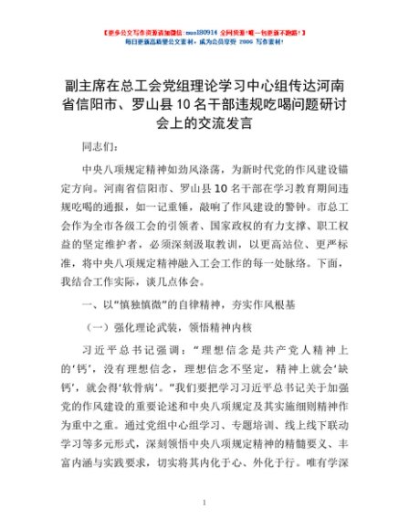 / 副主席在总工会党组理论学习中心组传达河南省信阳市、罗山县10名干部违规吃喝问题研讨会上的交流发言