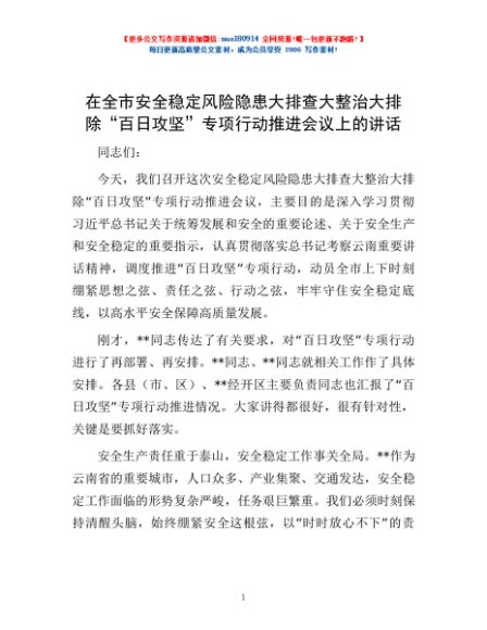 / 在全市安全稳定风险隐患大排查大整治大排除“百日攻坚”专项行动推进会议上的讲话